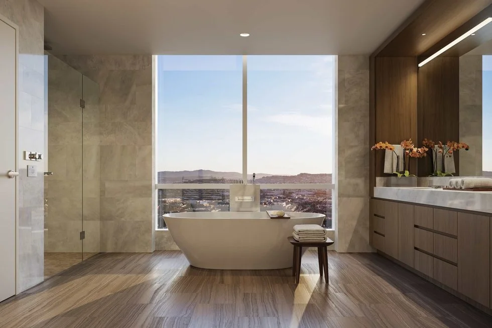Soaring 618 feet into the San Francisco skyline, the sculpted glass Avery tower is home to tony two- and three-bedroom condominiums, all bathed in natural light and panoramic city and Bay views through floor-to-ceiling windows. Designed by Rem Koolhaas' Pritzker Prize-winning firm Office of Metropolitan Architecture(OMA) along with Clodagh Design, floor plans have an eco-conscious aesthetic and exude a sense of serenity and wellness. Expect gourmet kitchens with wine storage; spa-inspired bathrooms clad in warm wood and cool marble; polished chrome Dornbracht fixtures; custom oak cabinetry; mosaic tiles. On floors 53 and 56, the penthouses are extra opulent with stone fireplaces, great rooms, formal dining spaces, master suites with dual walk-in closets and soaking tubs; and some even have rooftop patios. Whether you're on top of the world or live on a lower floor, you'll have access to valet parking, the gym, pool, entertainment lounges, and an attended private lobby.